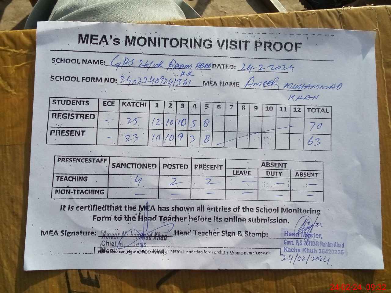 | Attendance Register | Head Teacher | MEA with School | Visit Proof |