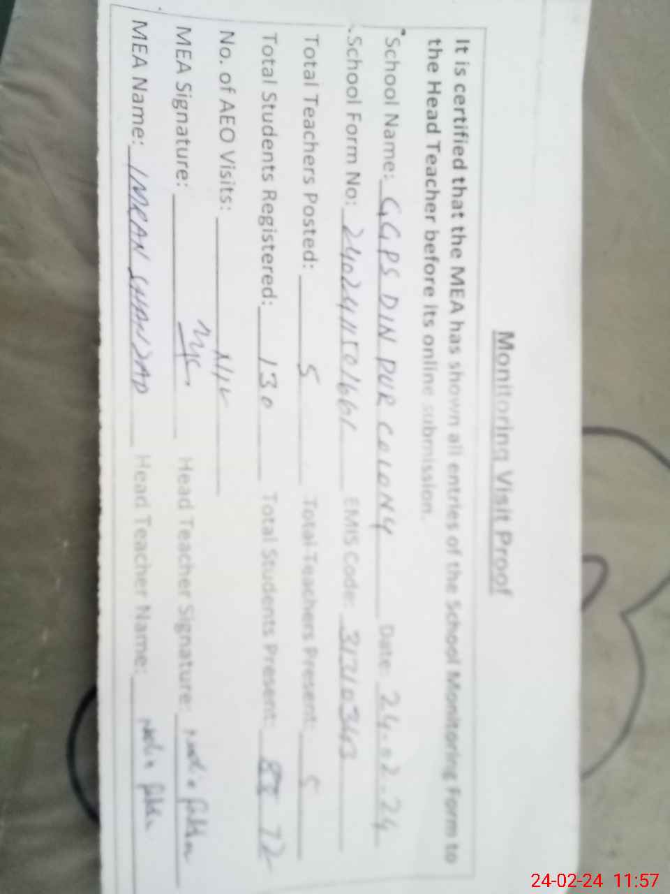 | Attendance Register | Head Teacher | MEA with School | Visit Proof |
