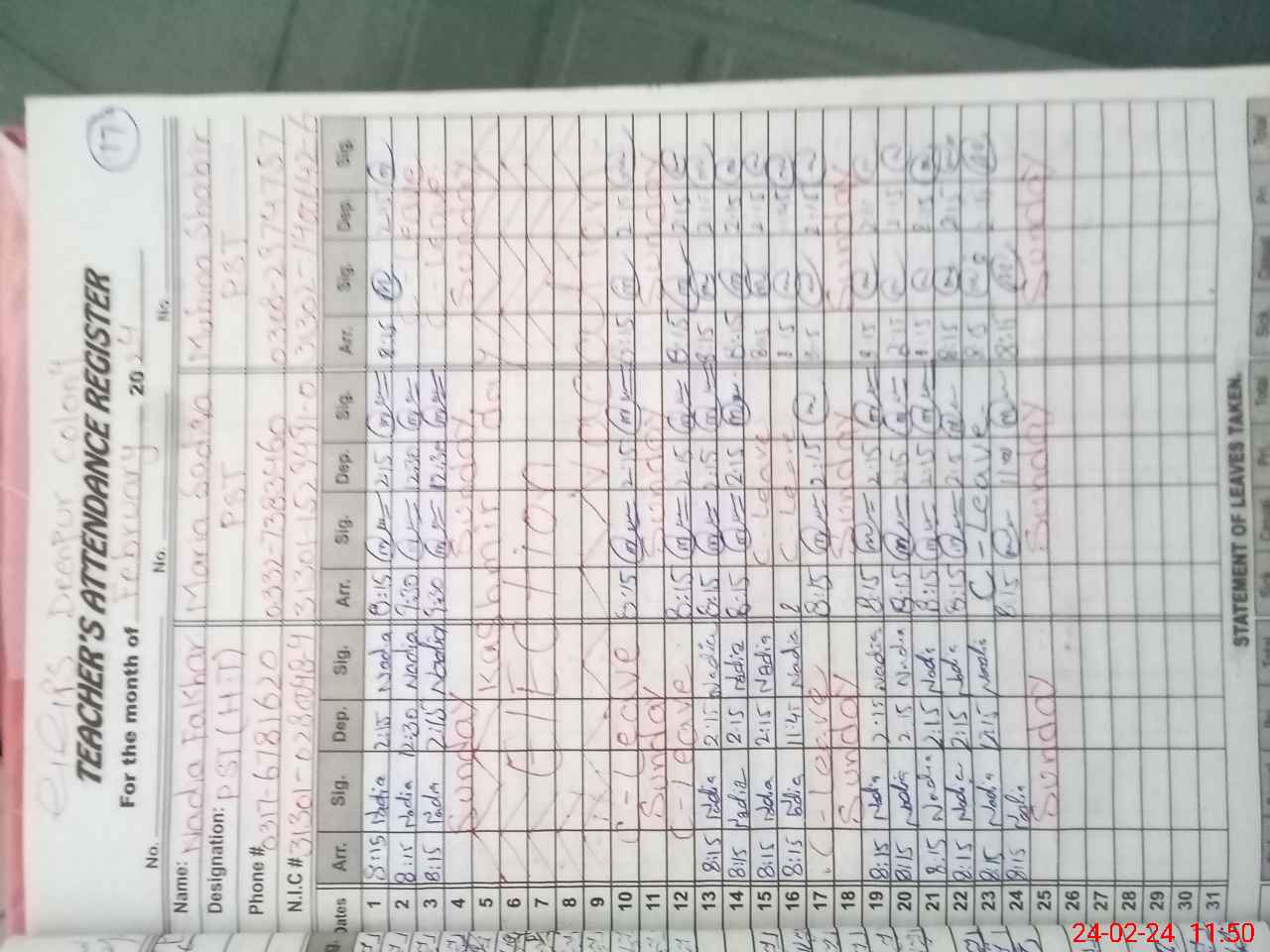 | CNIC | Full Name | Designation | R/C | Absence During Last Calender Month |