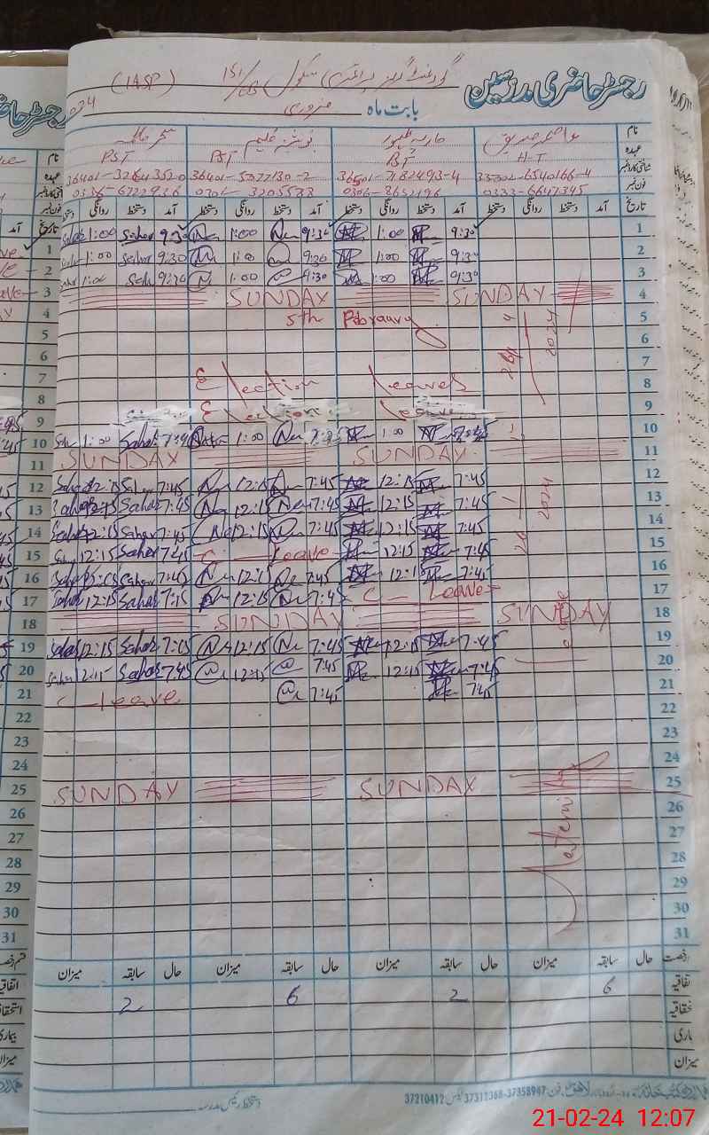 | CNIC | Full Name | Designation | R/C | Absence During Last Calender Month |