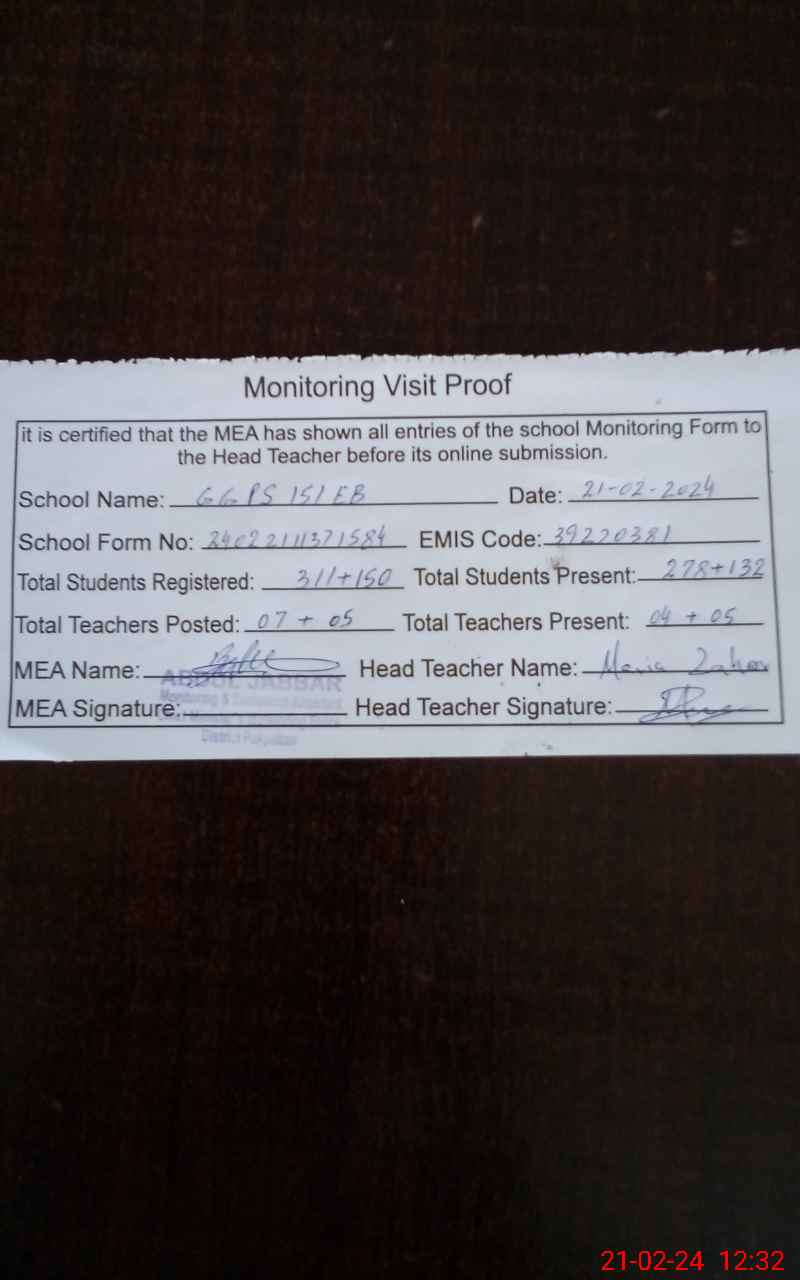 | EMIS Code: 39220381 | Name of School: GGPS 151 EB PO DILLOW WALA ARIFWALA | |||