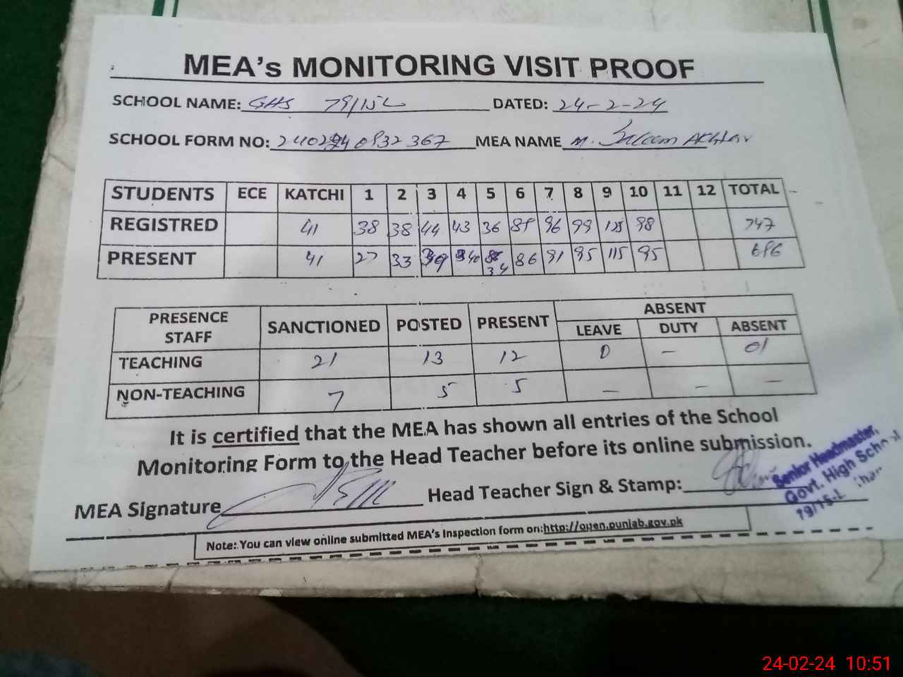 | Attendance Register | Head Teacher | MEA with School | Visit Proof |