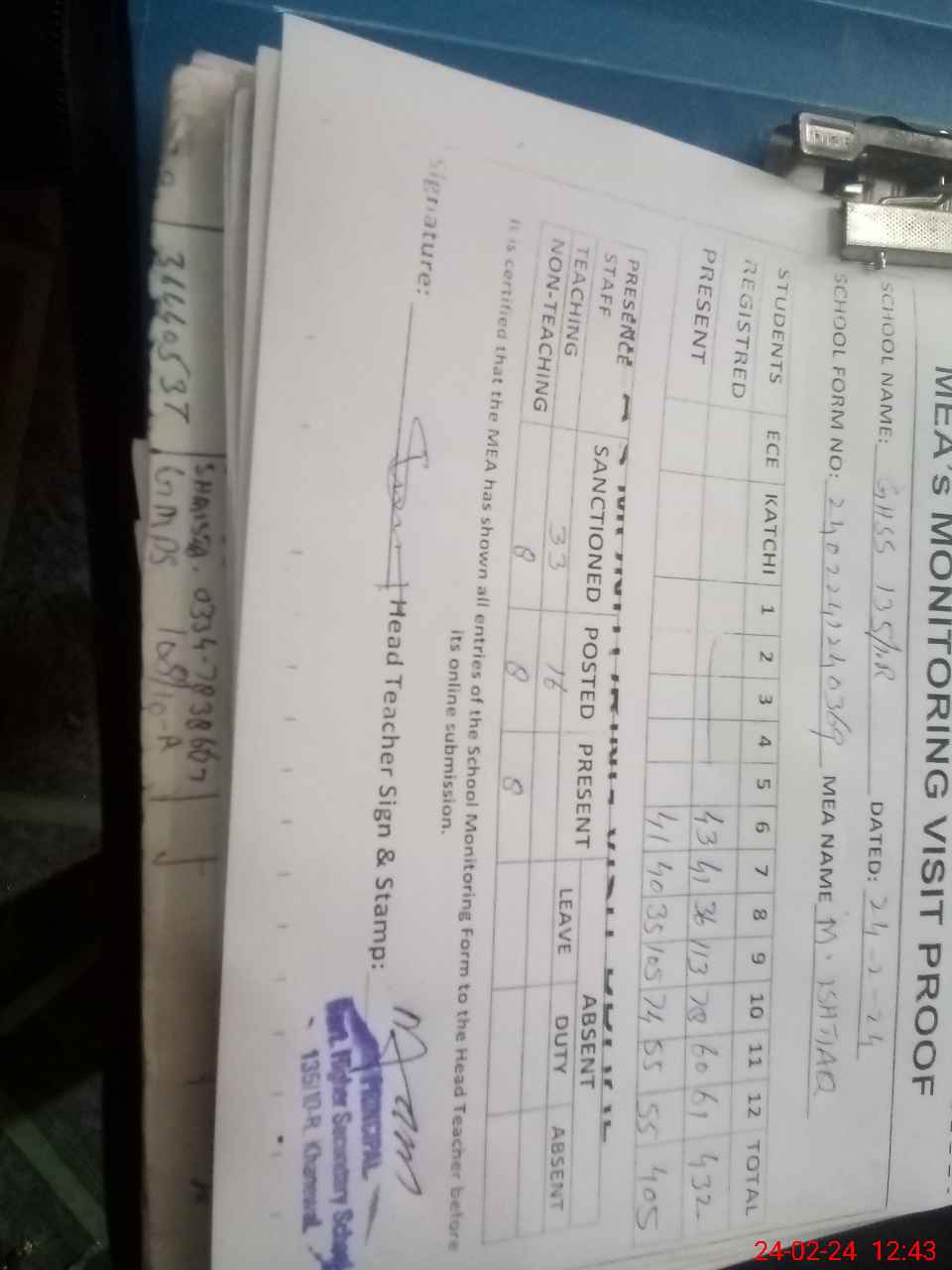 | Attendance Register | Head Teacher | MEA with School | Visit Proof |