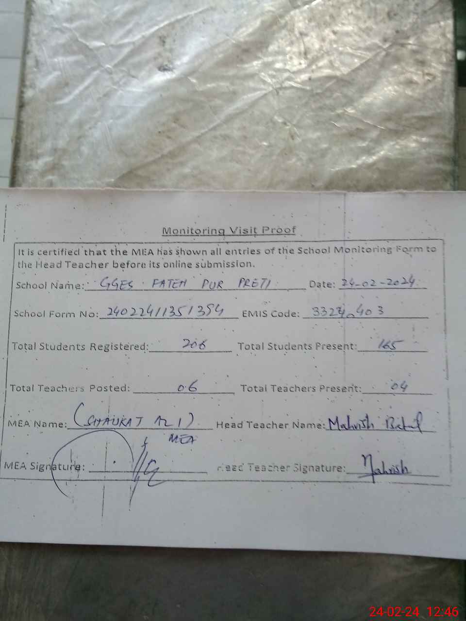 | Attendance Register | Head Teacher | MEA with School | Visit Proof |
