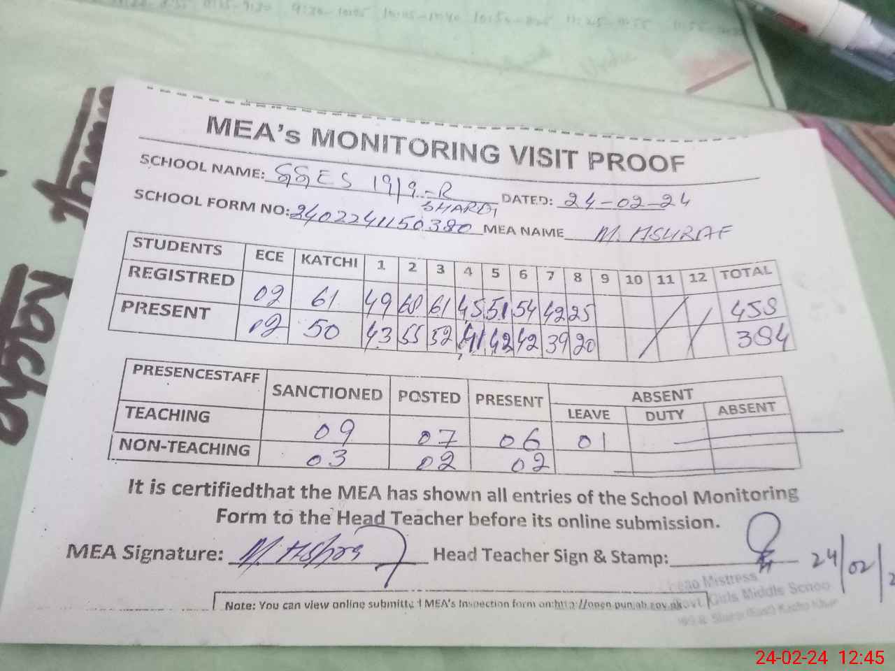 | Attendance Register | Head Teacher | MEA with School | Visit Proof |