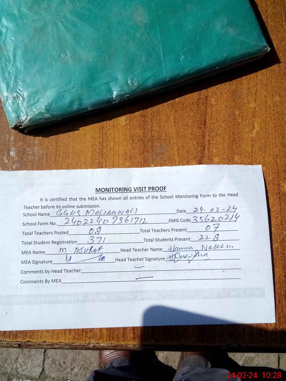| Attendance Register | Head Teacher | MEA with School | Visit Proof |