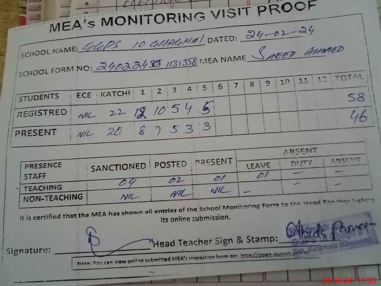 | Attendance Register | Head Teacher | MEA with School | Visit Proof |