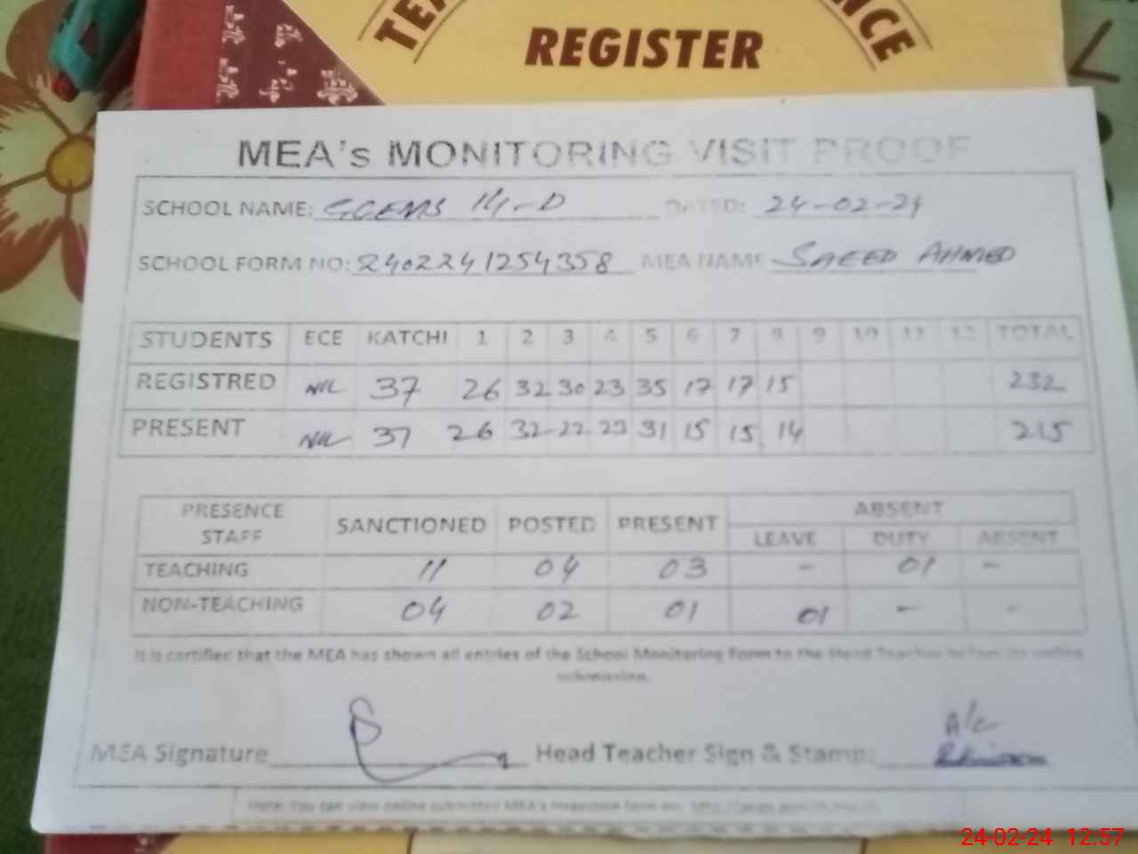 | Attendance Register | Head Teacher | MEA with School | Visit Proof |