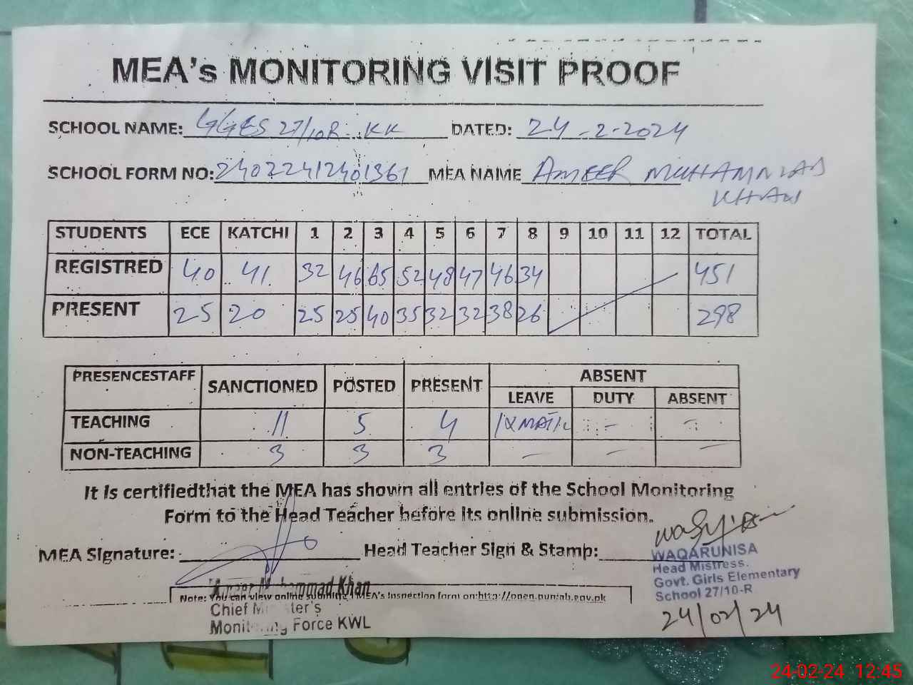 | Monitoring Date: 24-02-2024 | Start Time: 24-02-2024 11:48 AM | End Time: 24-02-2024 01:01 PM | Name of MEA: Am**** Mu**** Kh**** | |