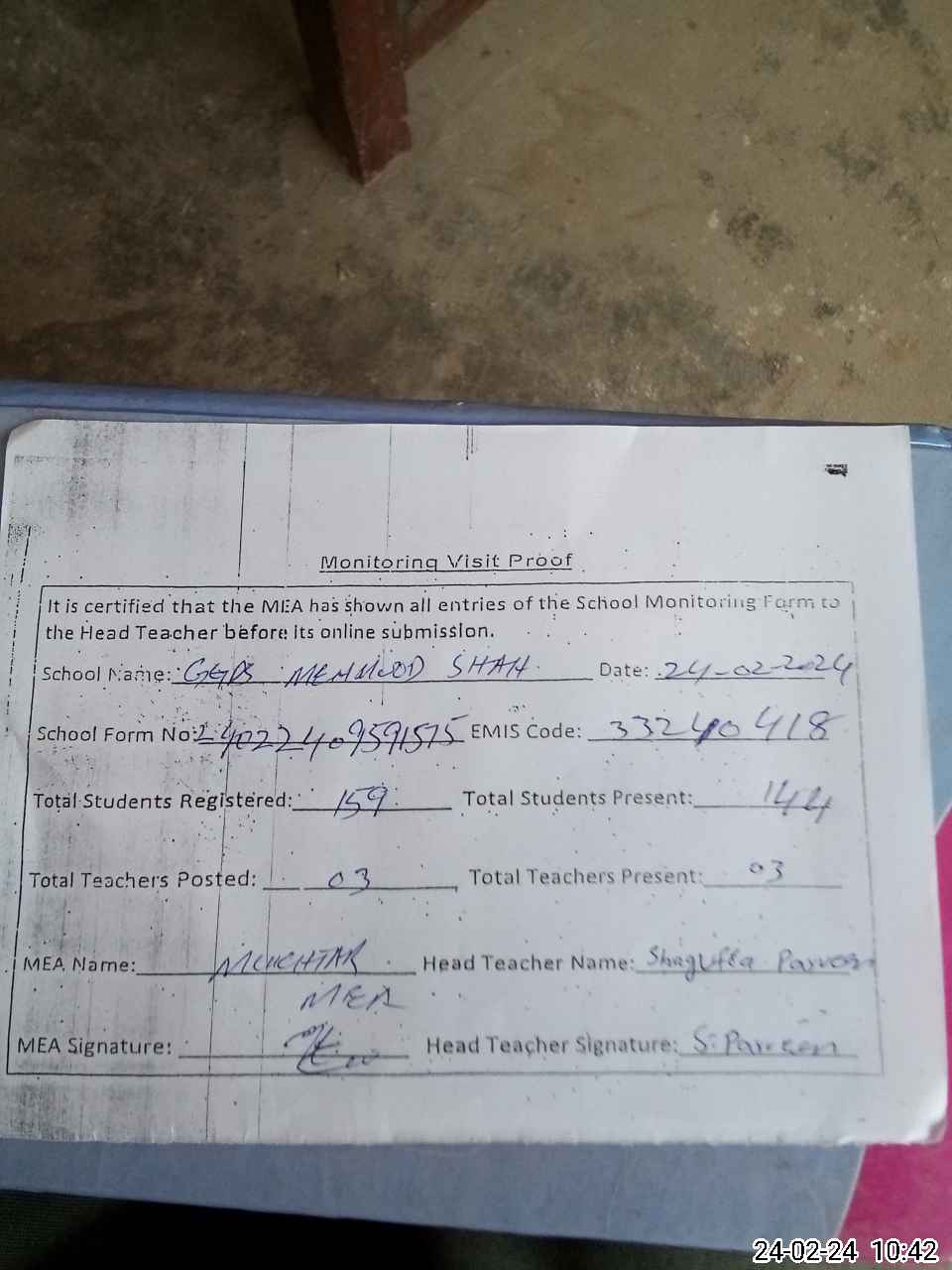 | EMIS Code: 33240418 | Name of School: GGPS MEHMOOD SHAH | |||