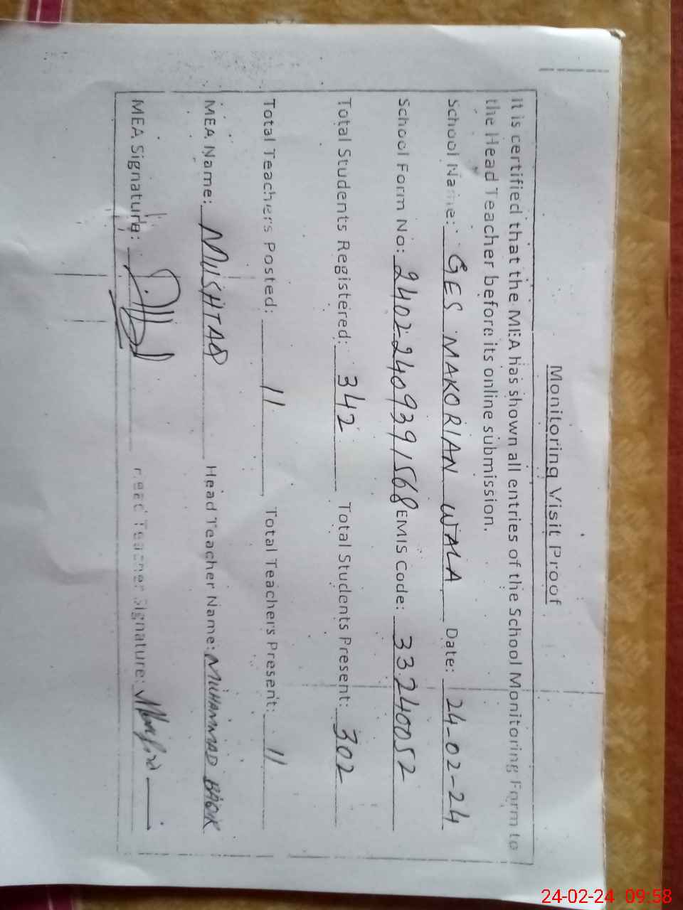 | Certified that this School was Inspected by the Undersigned MEA/DMO Today and the Information Stated Above is as Per Record. | |||||