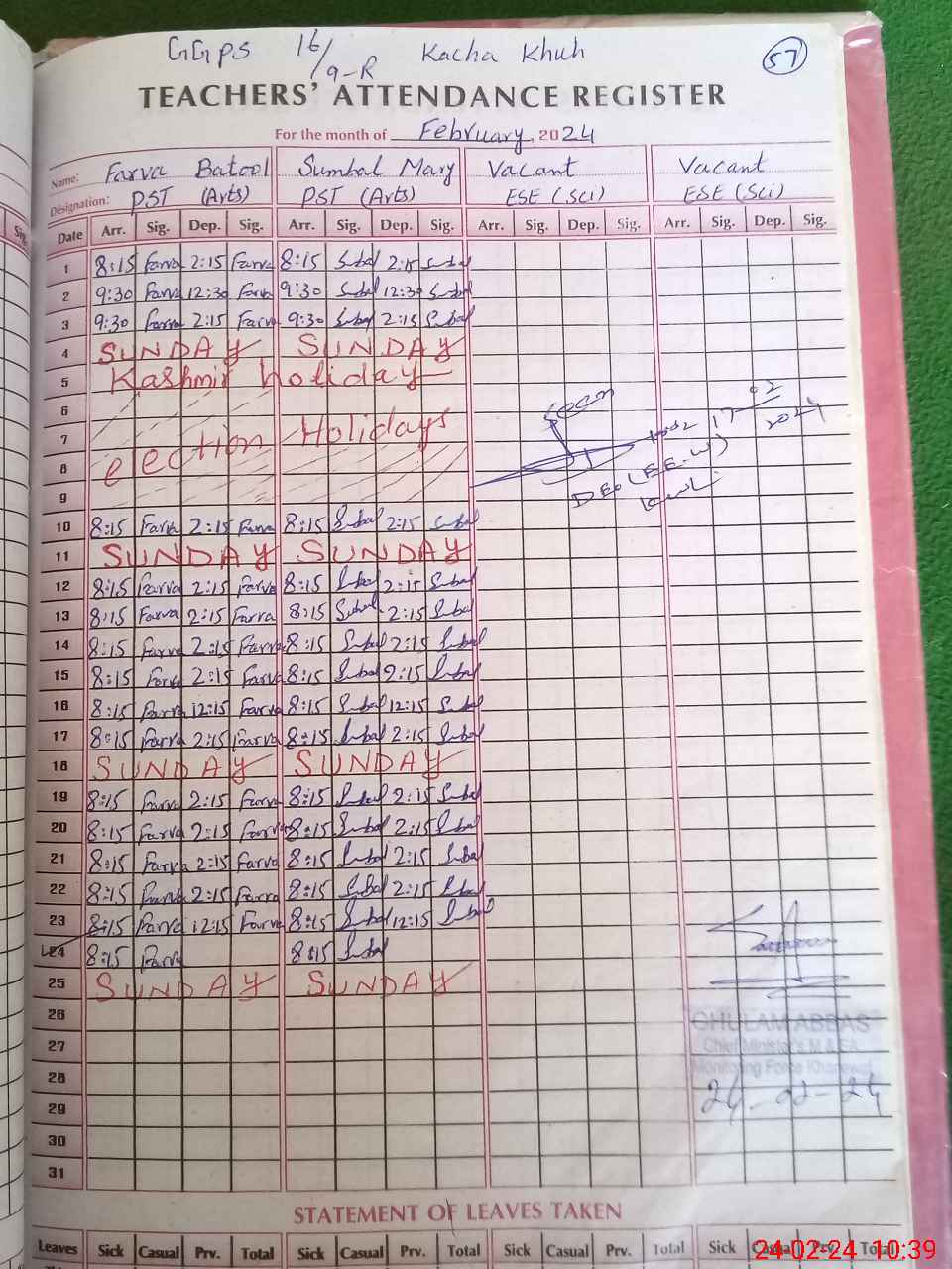 | Remarks (Use Separate Page if Required): No aeo visit in last two months During random attendance of 15 students listed students are promotted to next classes | |||||