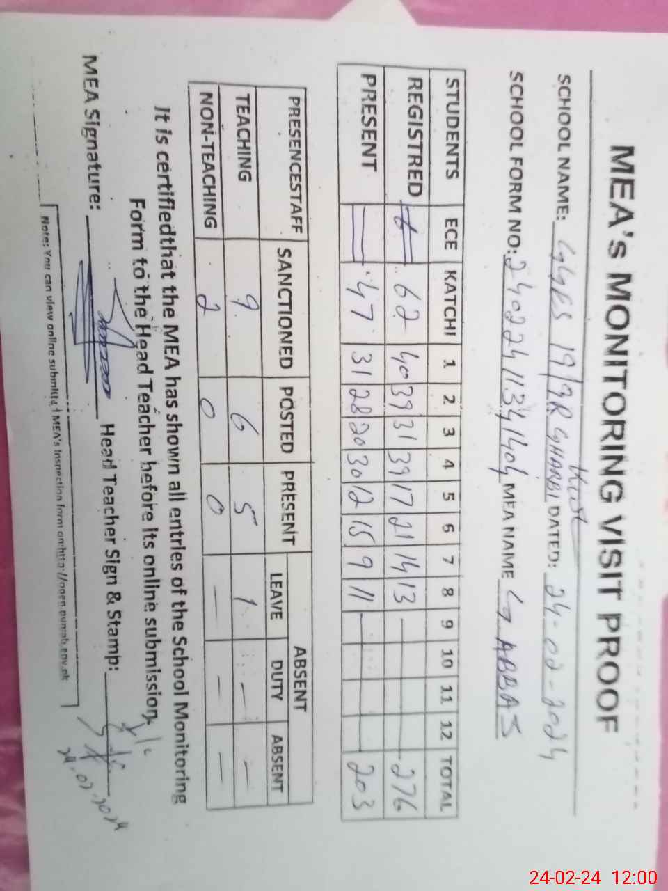 | Attendance Register | Head Teacher | MEA with School | Visit Proof |