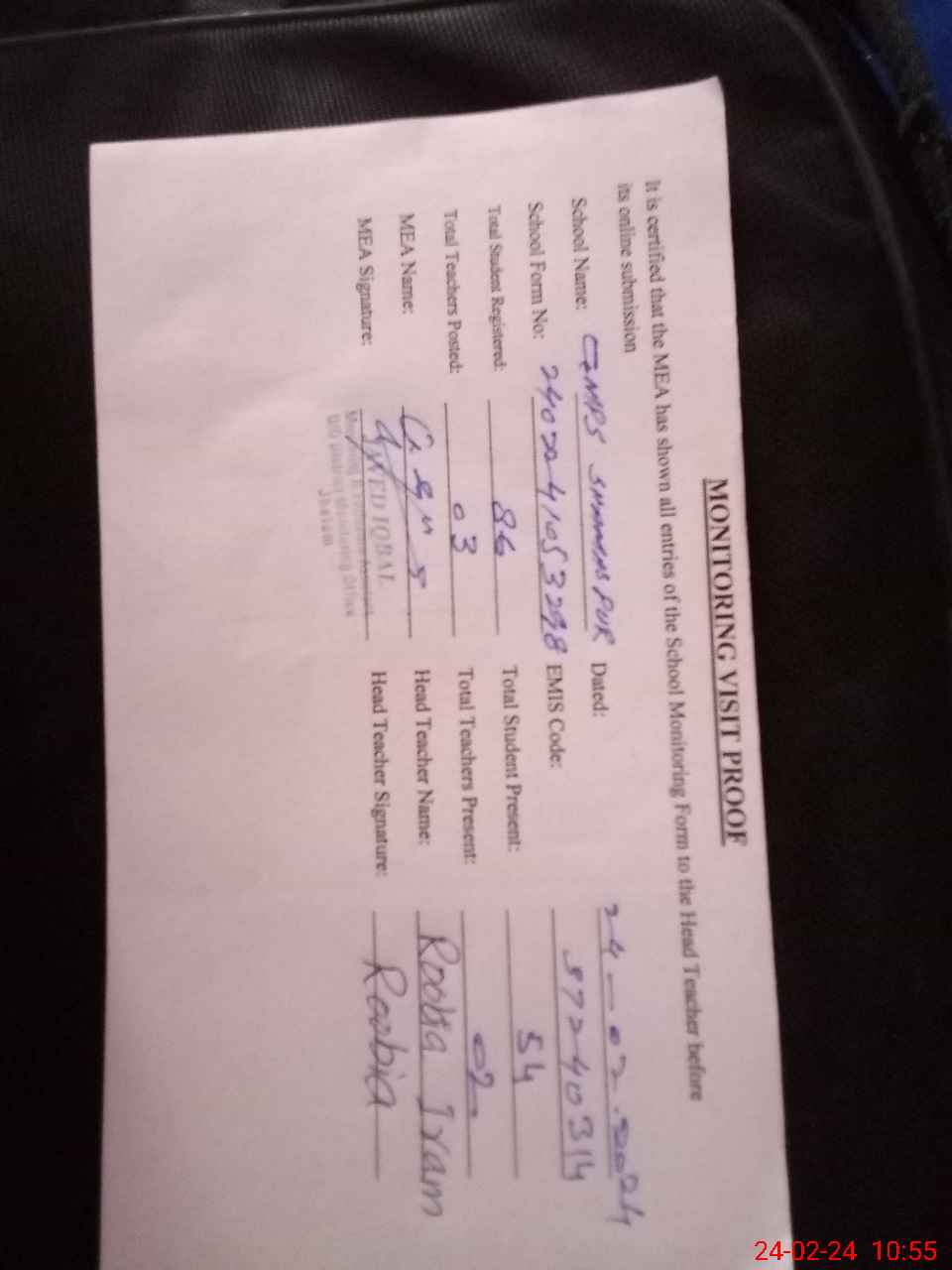 | Attendance Register | Head Teacher | MEA with School | Visit Proof |