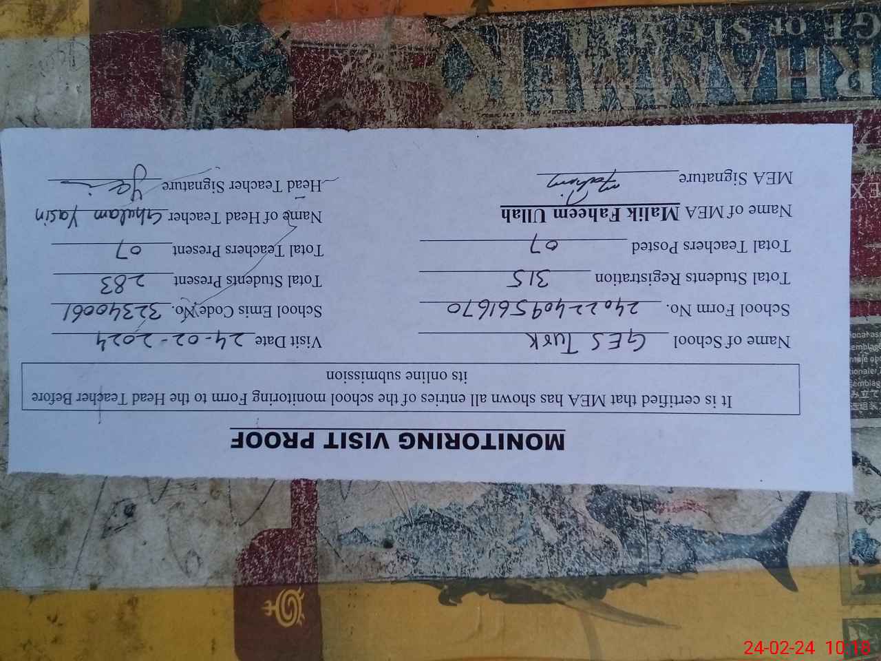 | Certified that this School was Inspected by the Undersigned MEA/DMO Today and the Information Stated Above is as Per Record. | |||||