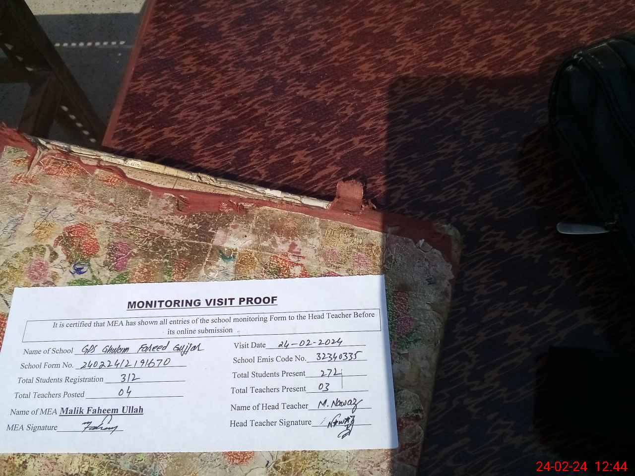 | Attendance Register | Head Teacher | MEA with School | Visit Proof |