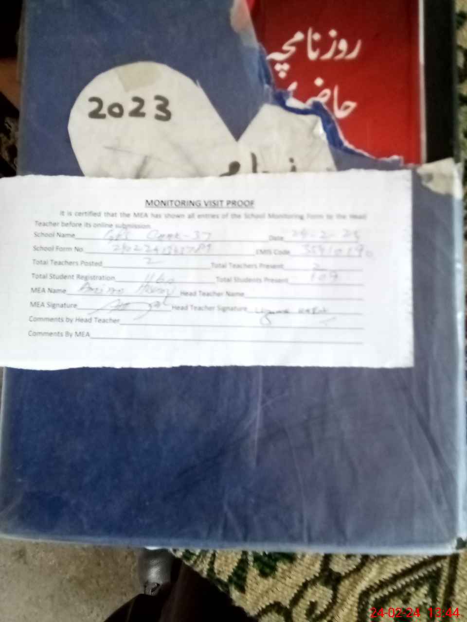 | Attendance Register | Head Teacher | MEA with School | Visit Proof |