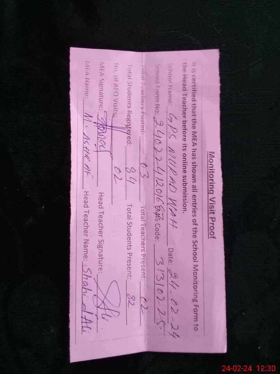| Attendance Register | Head Teacher | MEA with School | Visit Proof |