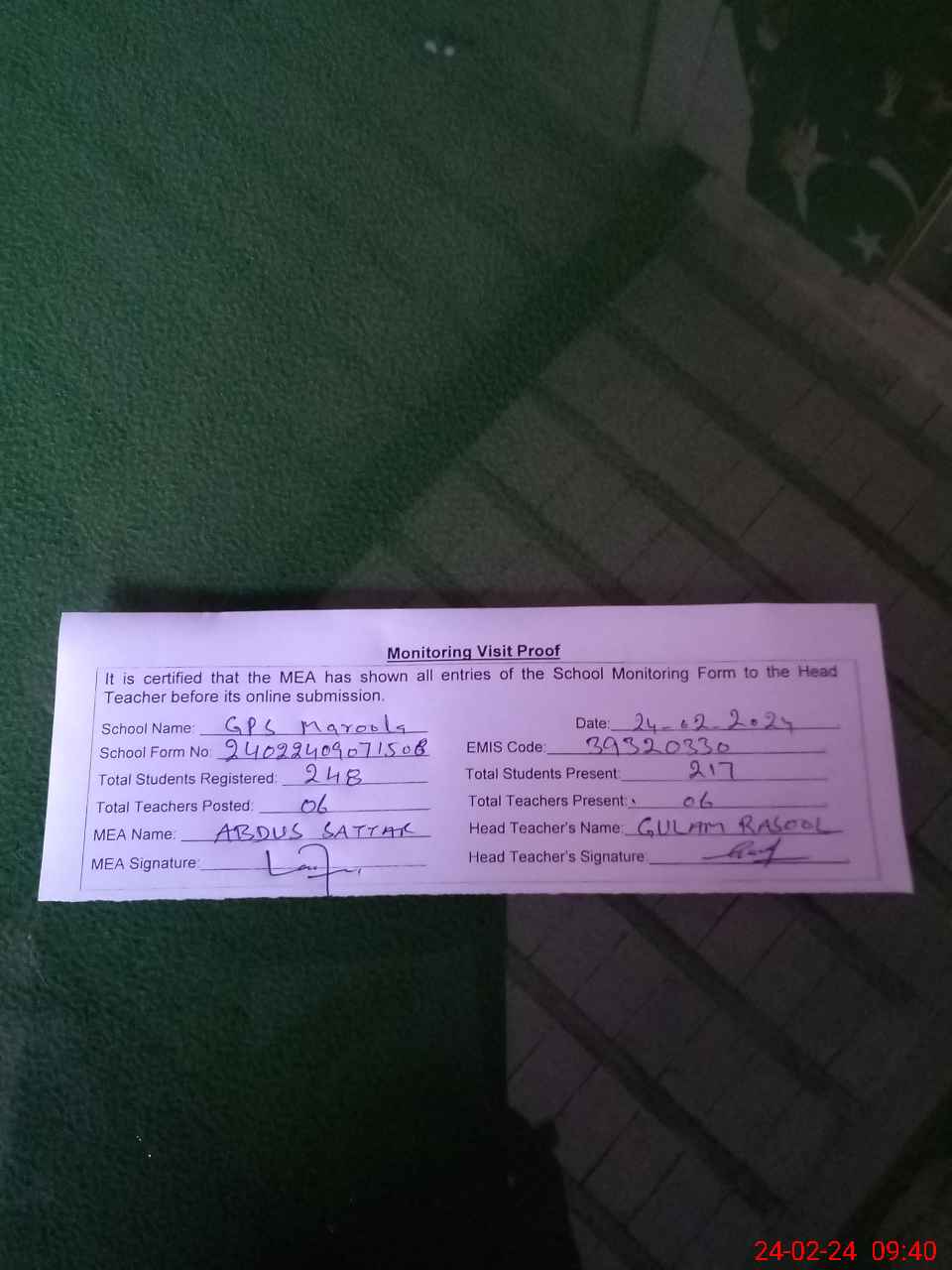 | Attendance Register | Head Teacher | MEA with School | Visit Proof |