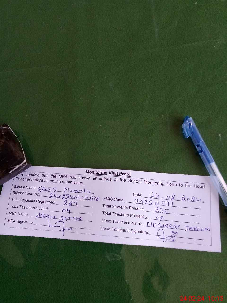 | Certified that this School was Inspected by the Undersigned MEA/DMO Today and the Information Stated Above is as Per Record. | |||||