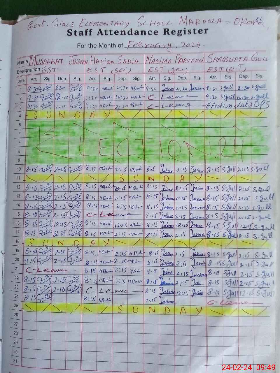 | CNIC | Full Name | Designation | R/C | Absence During Last Calender Month |