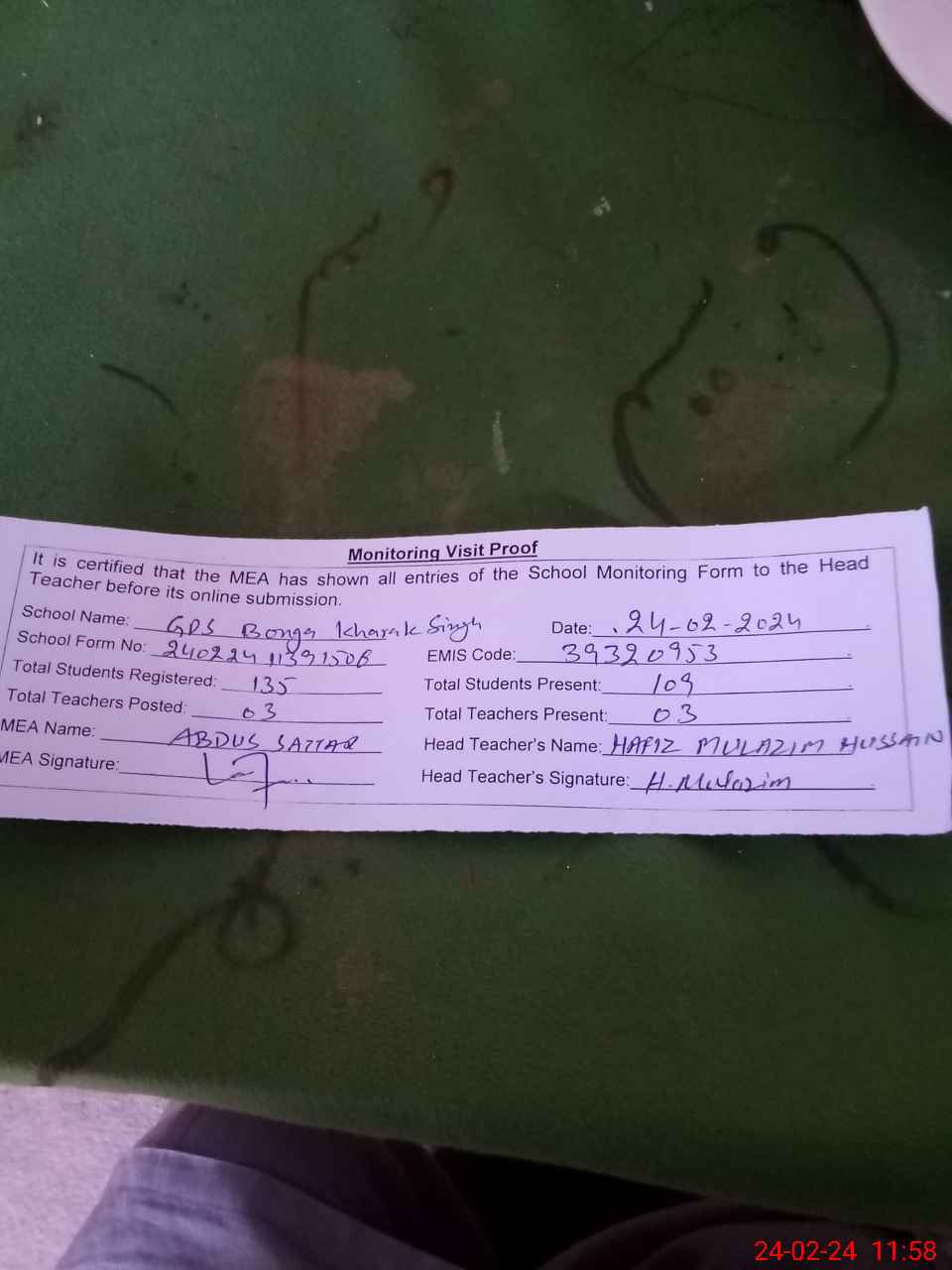 | Attendance Register | Head Teacher | MEA with School | Visit Proof |