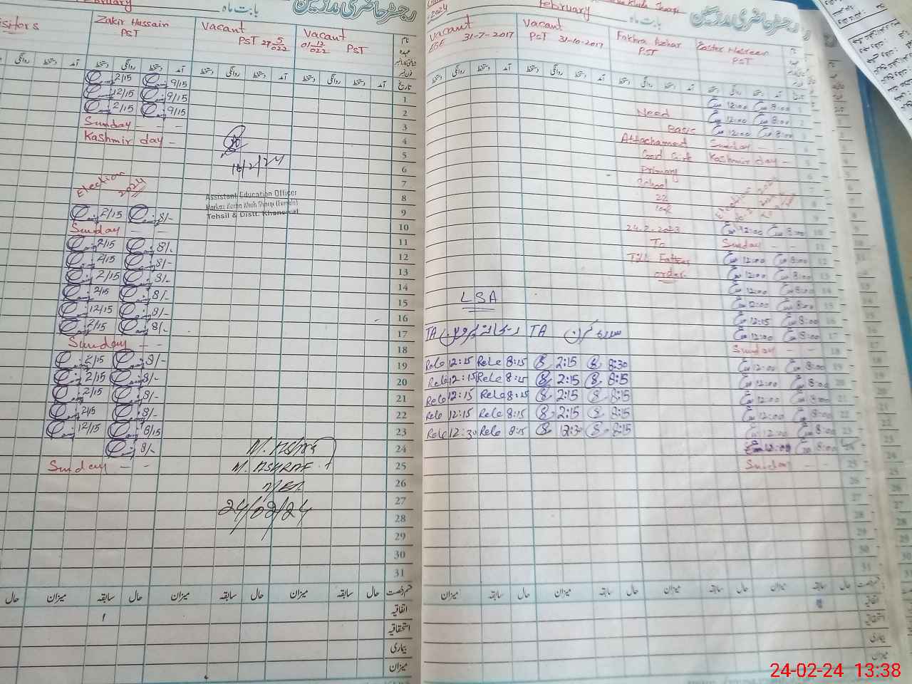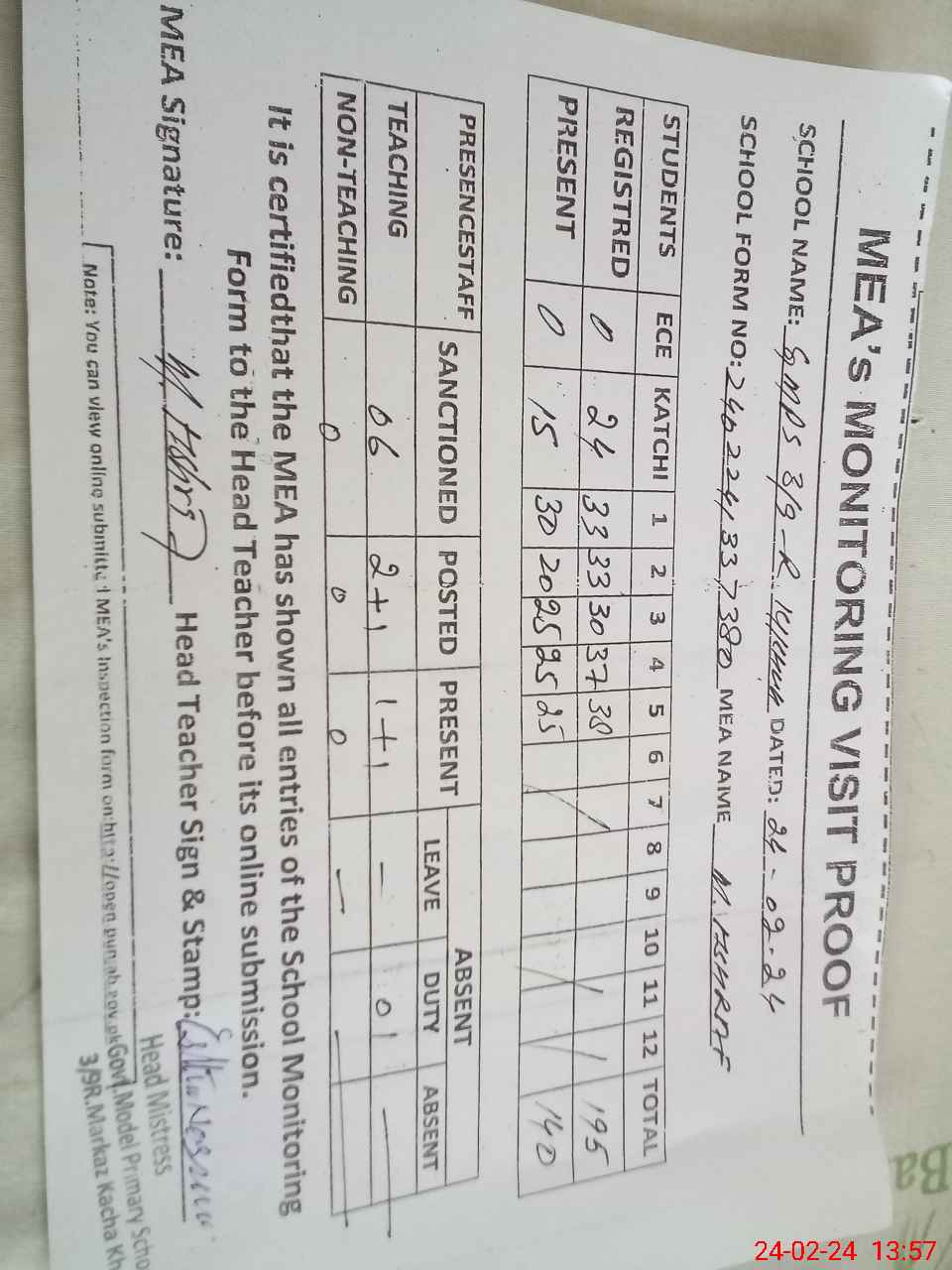 | Remarks (Use Separate Page if Required): Note Miss fakhara Azhar pst on need base duty WEF 27 janvery 2023 to till date and single teacher is running the school Total sanctioned 06 Filled 02 Working in school 01 and one teacher attached from other school NSB AND FTF RECORD NOT PROPERLY MAINTAINED | |||||