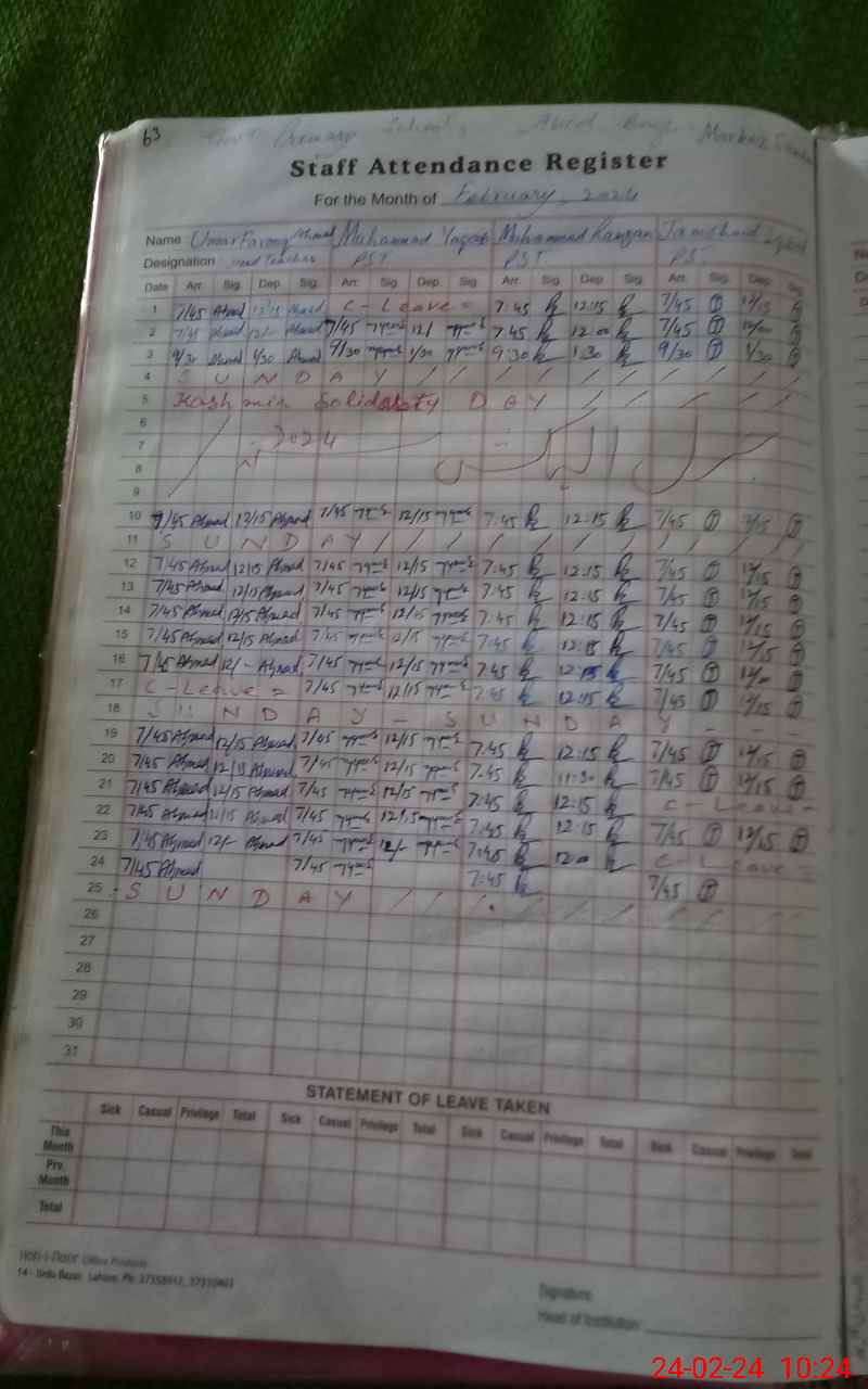 | CNIC | Full Name | Designation | R/C | Absence During Last Calender Month |