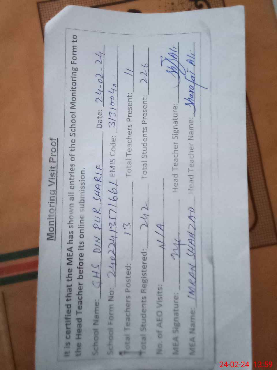 | Attendance Register | Head Teacher | MEA with School | Visit Proof |