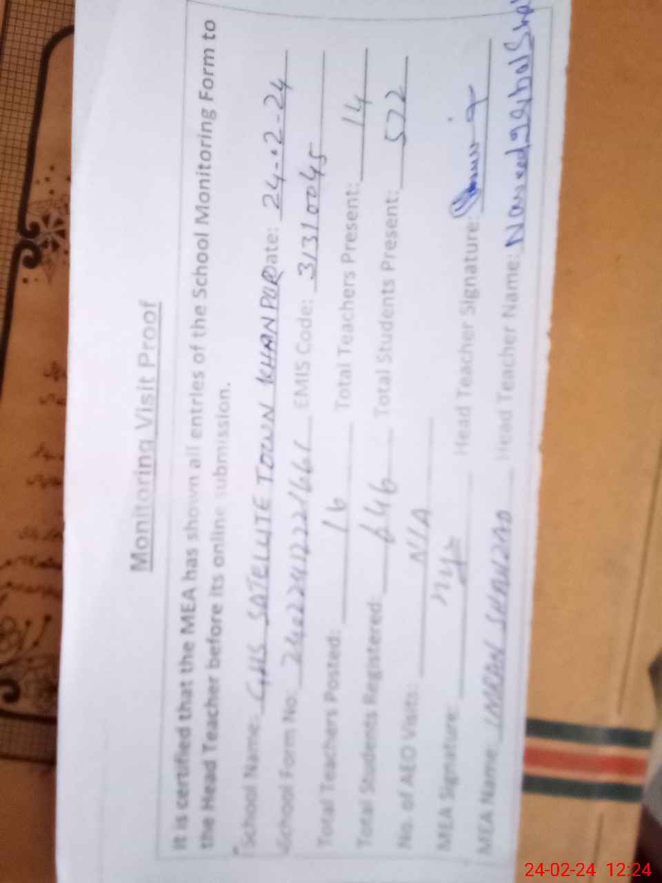 | Attendance Register | Head Teacher | MEA with School | Visit Proof |