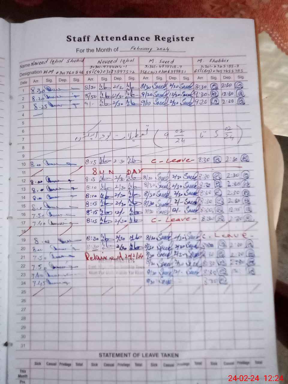 | CNIC | Full Name | Designation | R/C | Absence During Last Calender Month |
