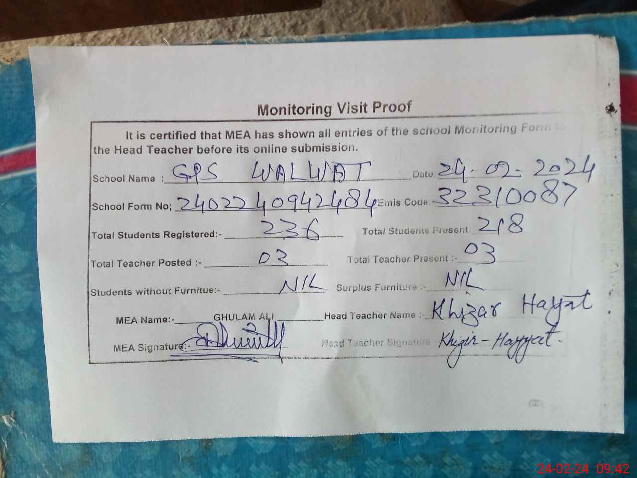 | EMIS Code: 32310087 | Name of School: GPS WALWAT | |||
