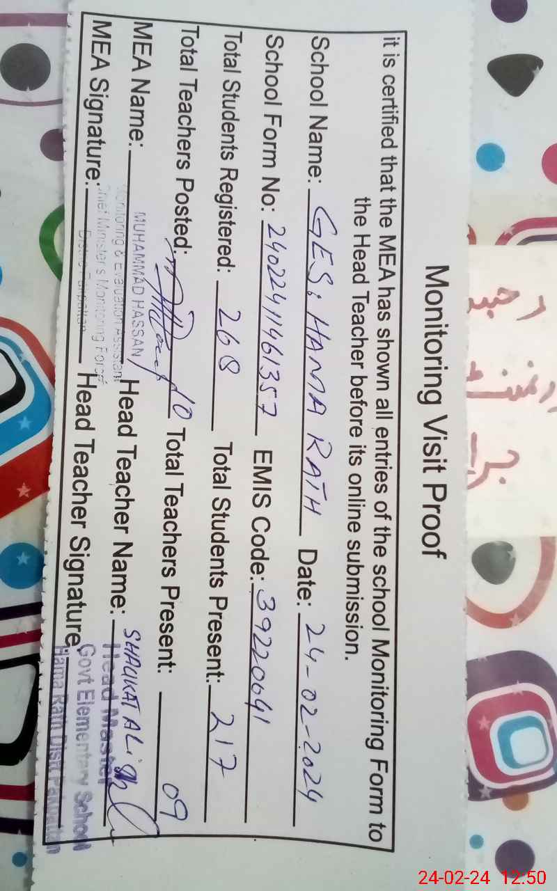 | Certified that this School was Inspected by the Undersigned MEA/DMO Today and the Information Stated Above is as Per Record. | |||||