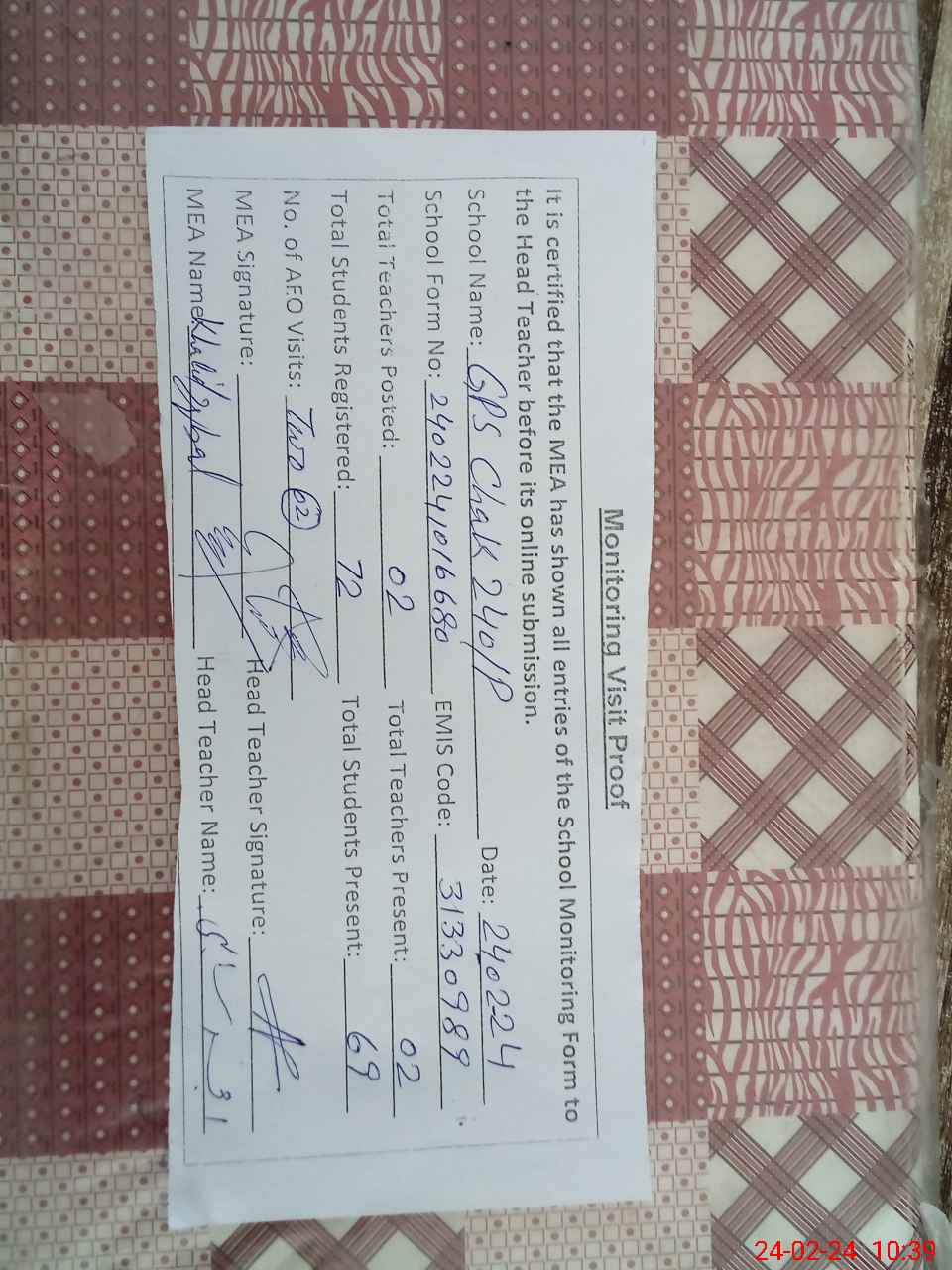| Attendance Register | Head Teacher | MEA with School | Visit Proof |