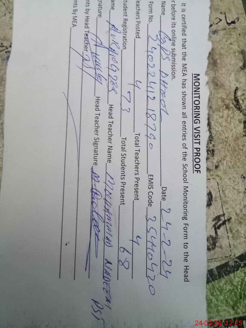 | Attendance Register | Head Teacher | MEA with School | Visit Proof |