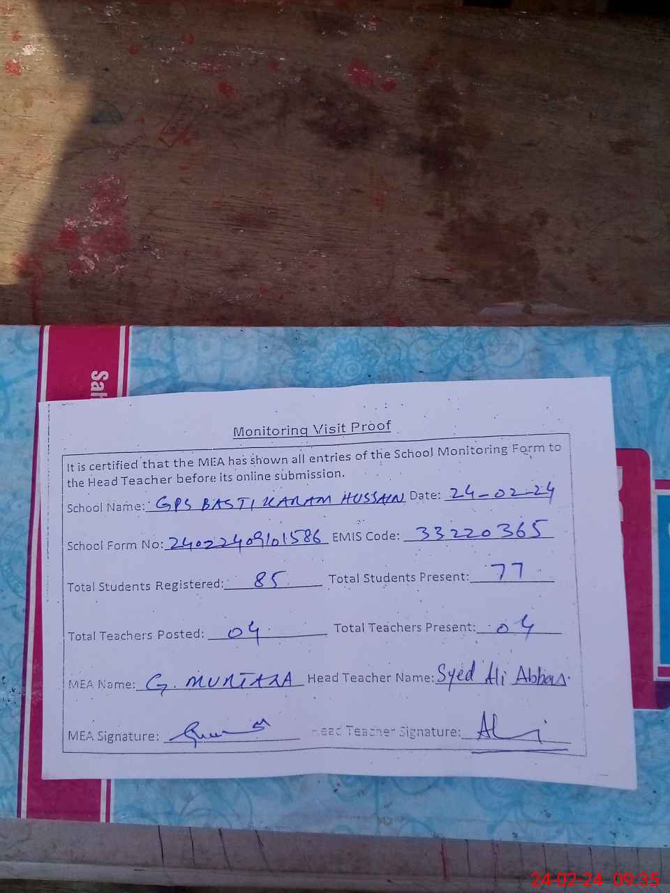 | Attendance Register | Head Teacher | MEA with School | Visit Proof |