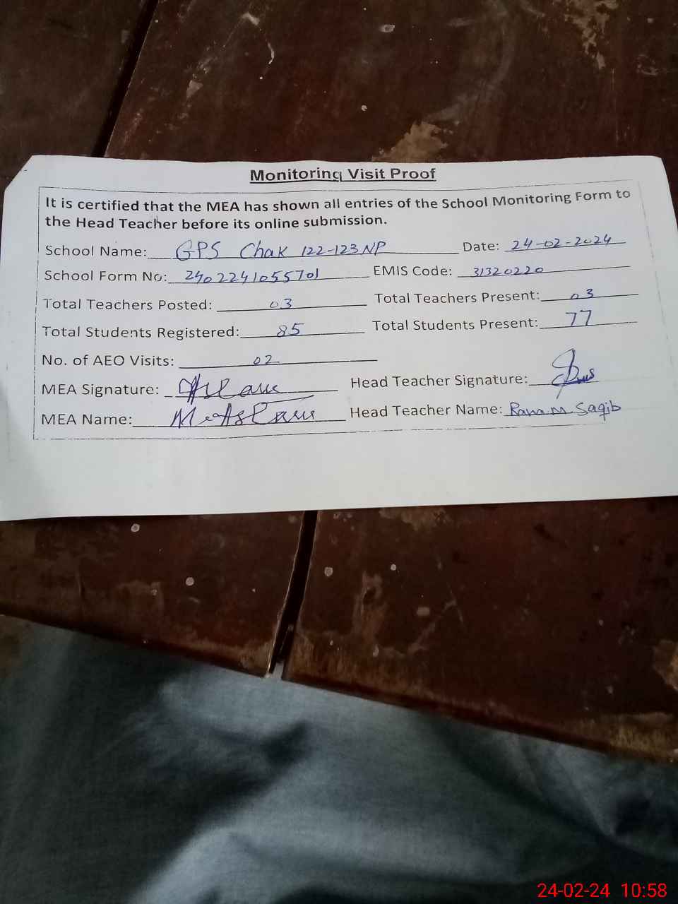 | EMIS Code: 31320220 | Name of School: GPS CHAK 122-123 NP | |||