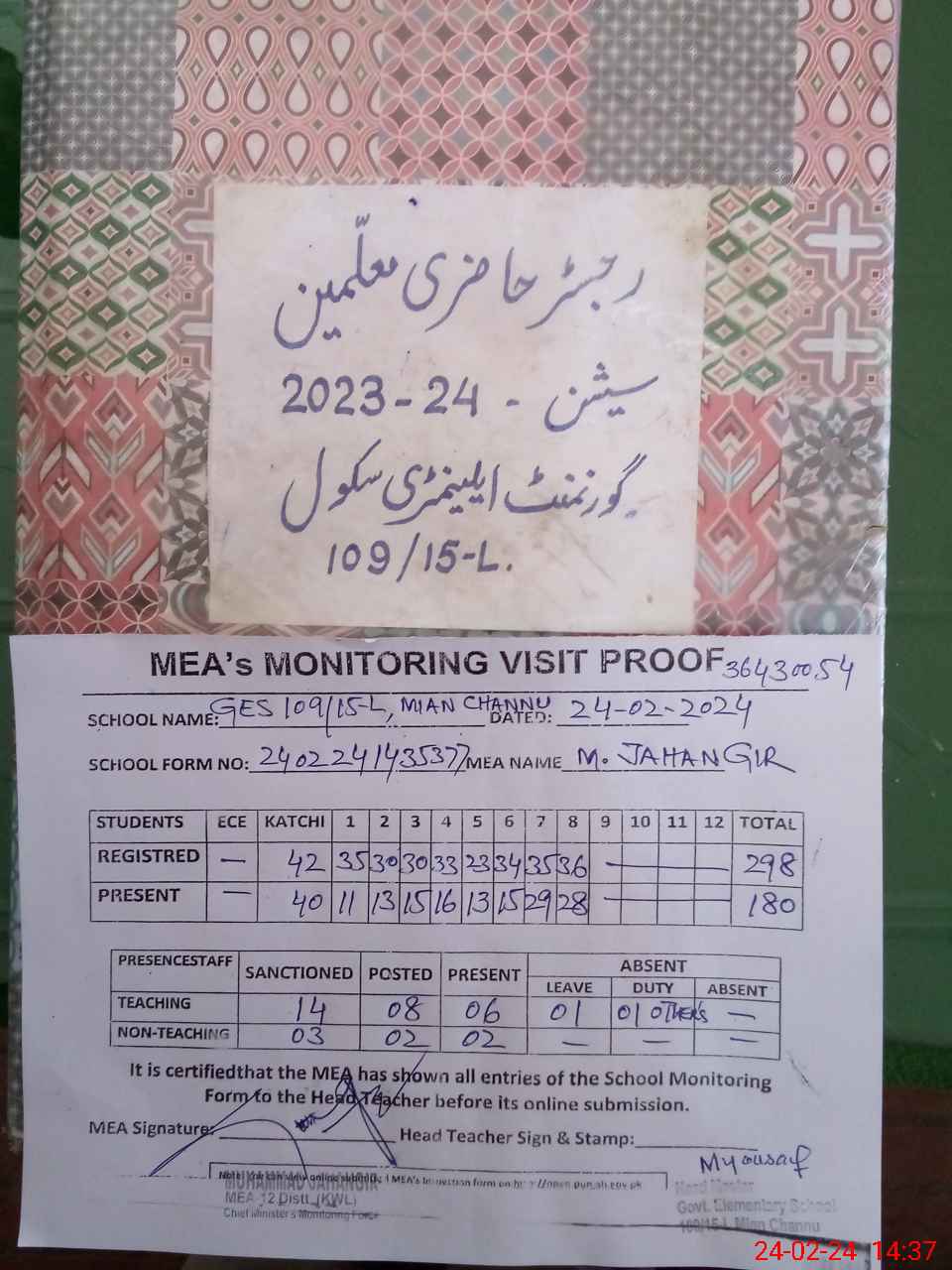 | EMIS Code: 36430054 | Name of School: GES 109/15-L, MIAN CHANNU | |||