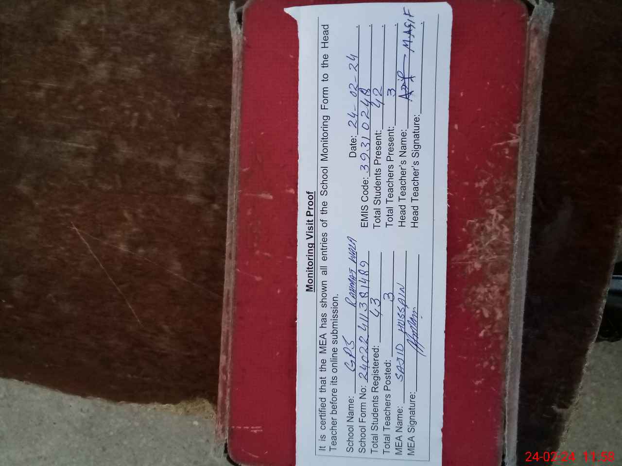 | Attendance Register | Head Teacher | MEA with School | Visit Proof |