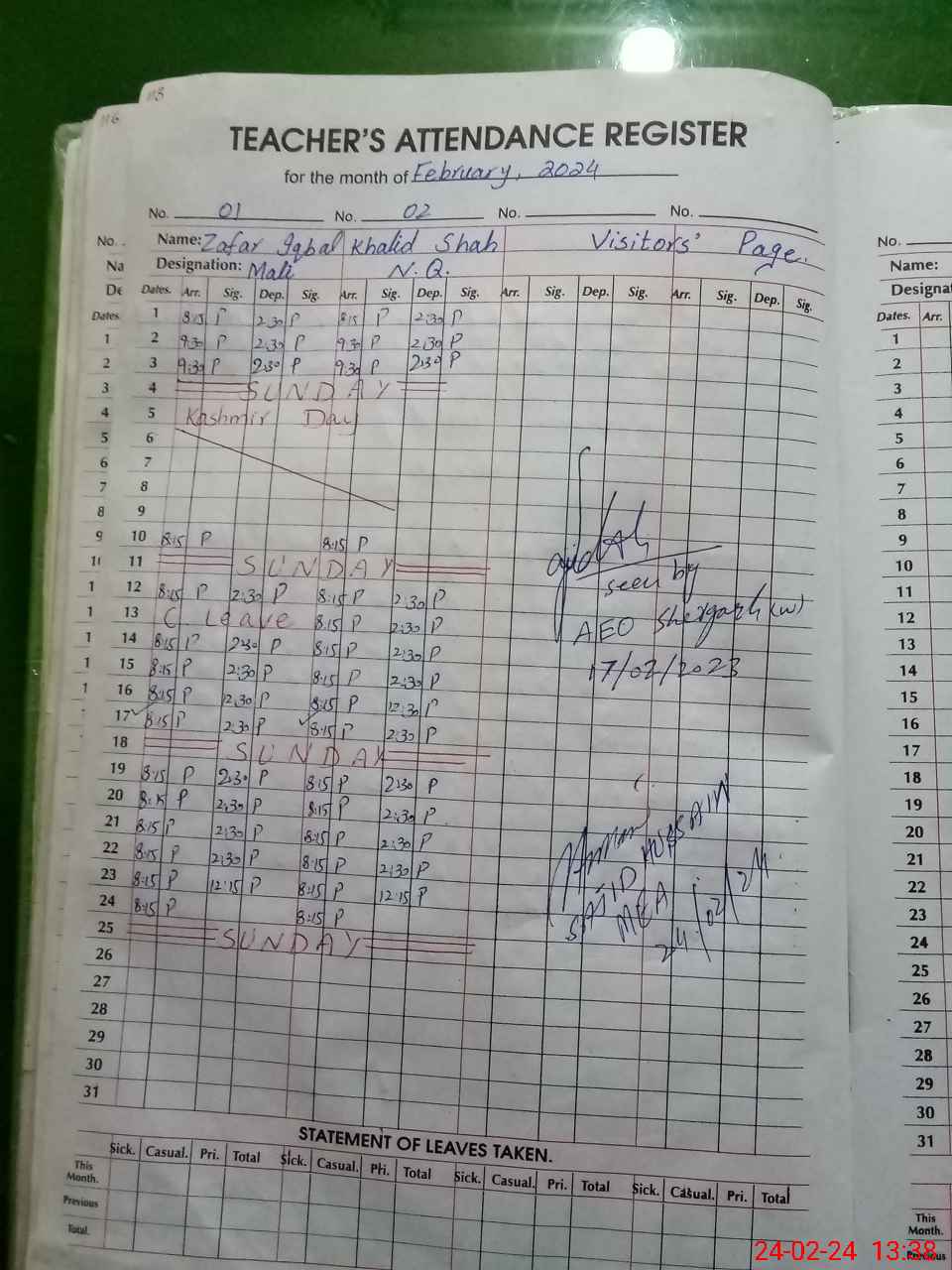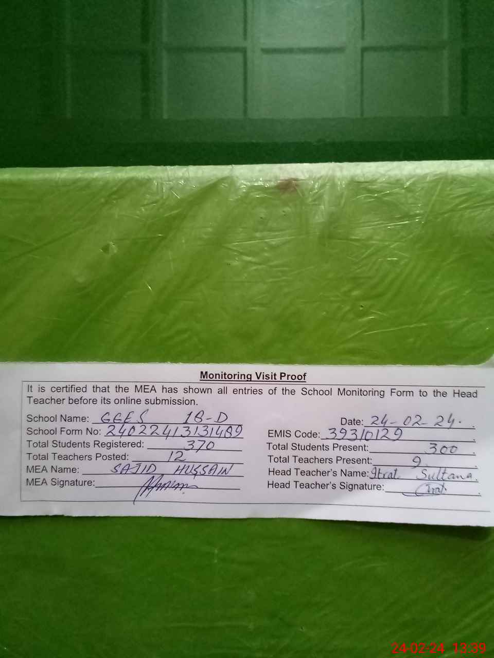 | Attendance Register | Head Teacher | MEA with School | Visit Proof |
