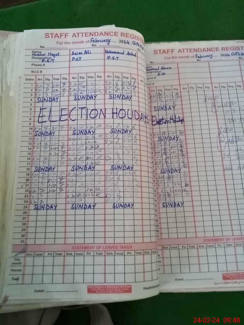 | CNIC | Full Name | Designation | R/C | Absence During Last Calender Month |