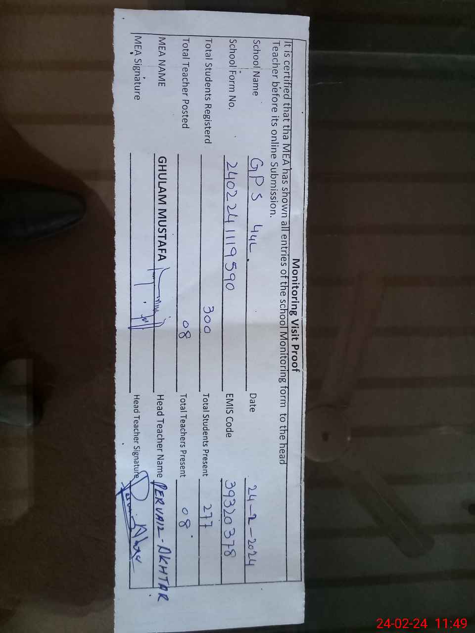 | Attendance Register | Head Teacher | MEA with School | Visit Proof |