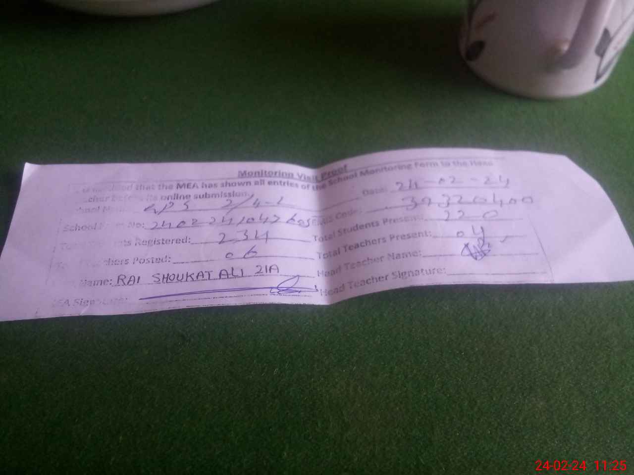 | Attendance Register | Head Teacher | MEA with School | Visit Proof |