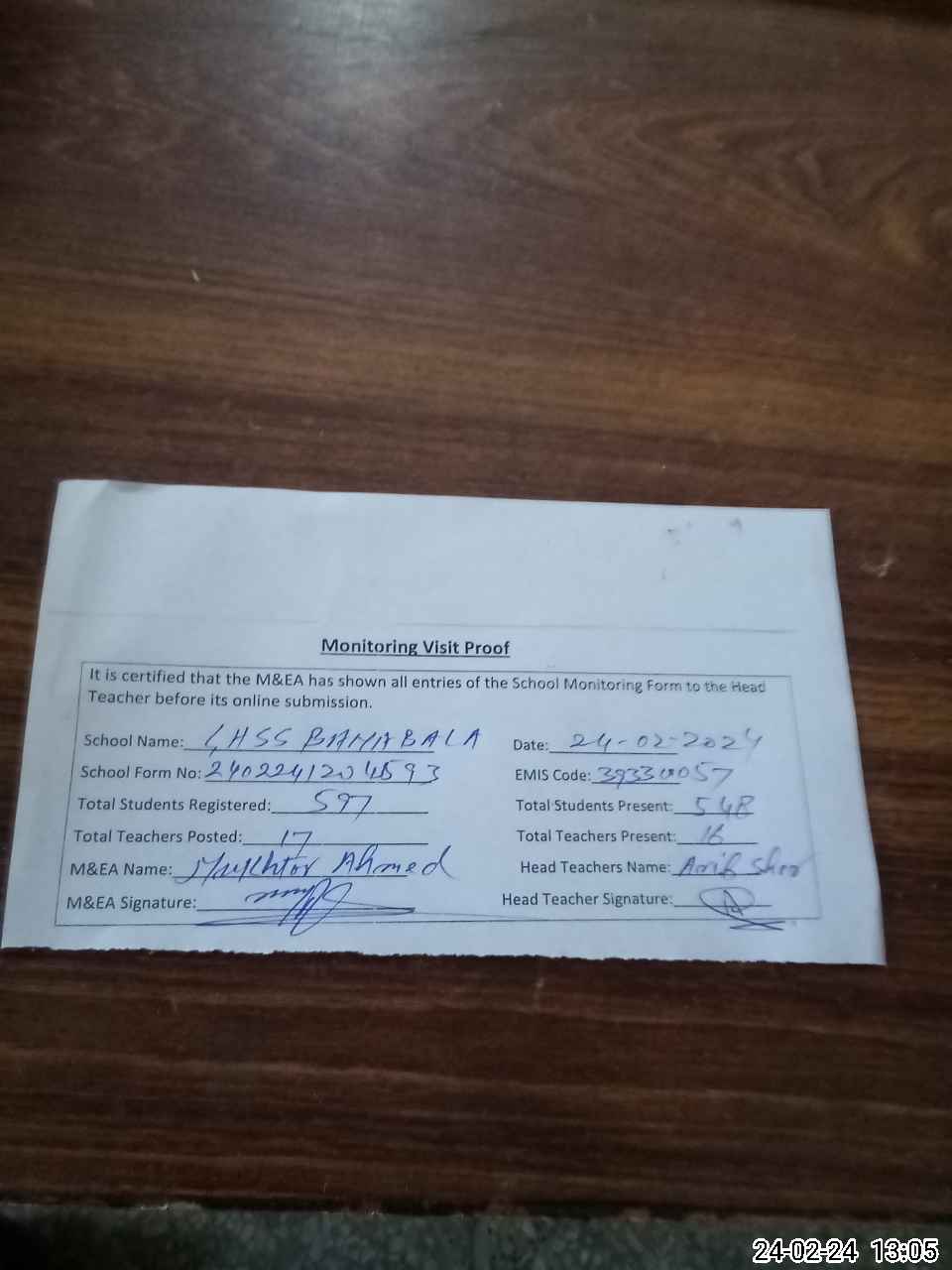 | Attendance Register | Head Teacher | MEA with School | Visit Proof |