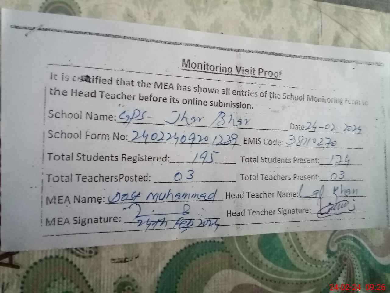 | EMIS Code: 38110270 | Name of School: GPS JHAR BHAR | |||