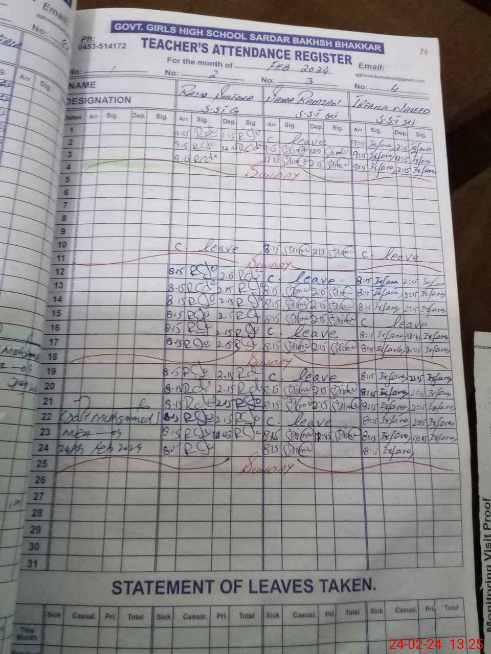 | CNIC | Full Name | Designation | R/C | Absence During Last Calender Month |