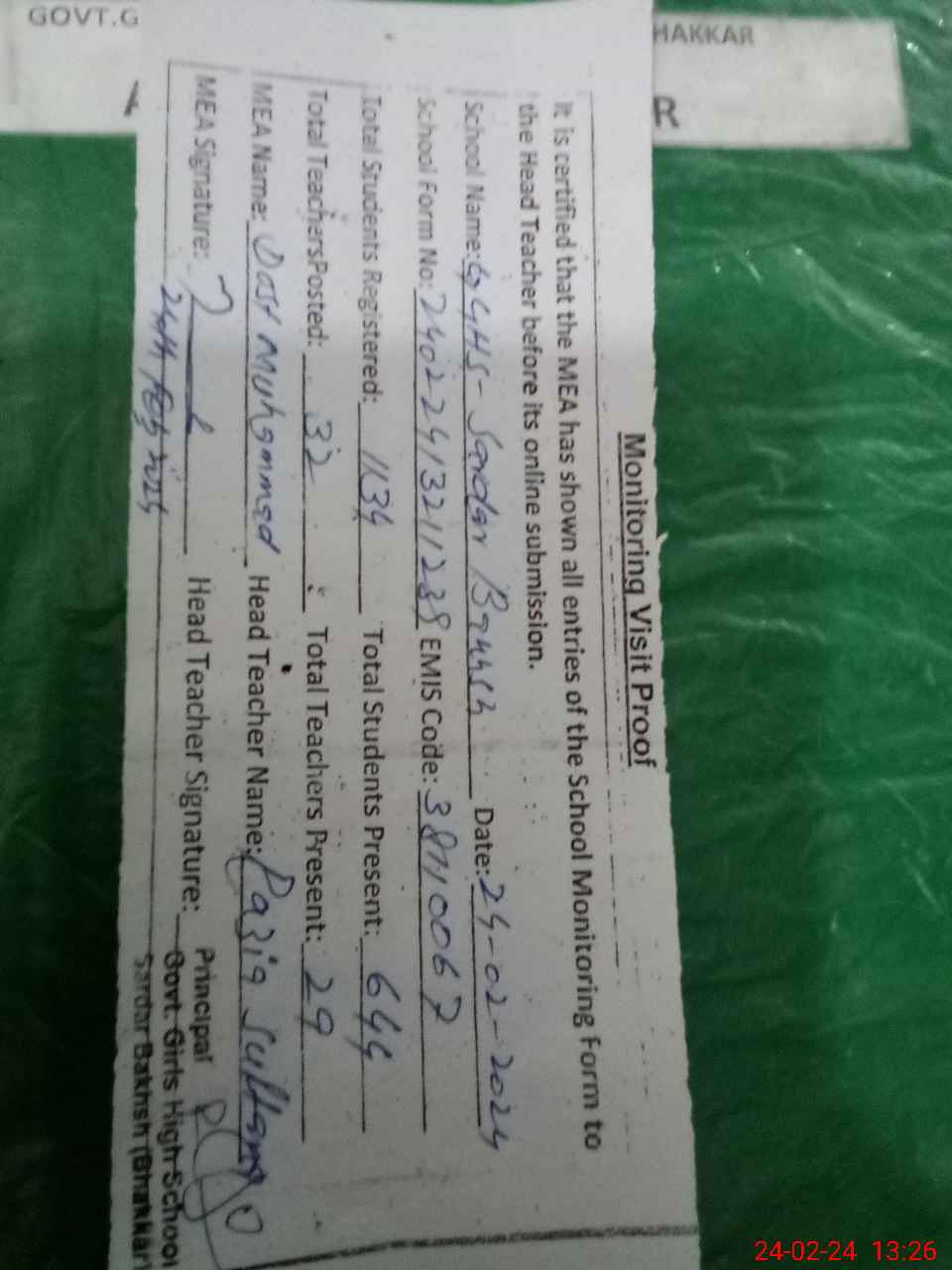 | Remarks (Use Separate Page if Required): All the entered data loudly share with the head teacher before submitting | |||||