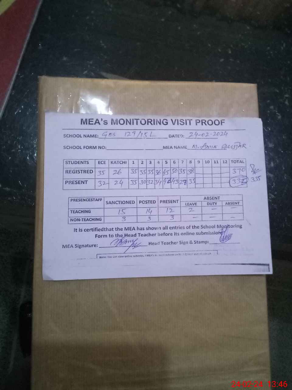 | Attendance Register | Head Teacher | MEA with School | Visit Proof |