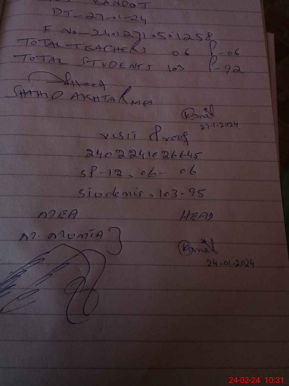 | Name: Ko**** Sa**** Designation: (School Headmaster's/Headmistress's) EST (G) Phone/Cell Number: 03**** |