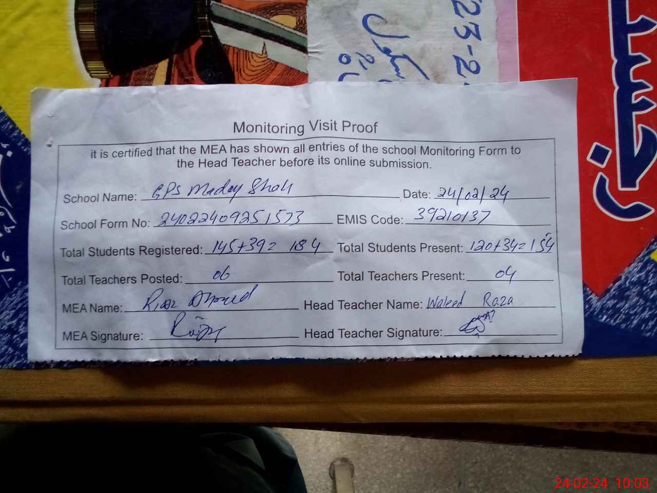 | Attendance Register | Head Teacher | MEA with School | Visit Proof |